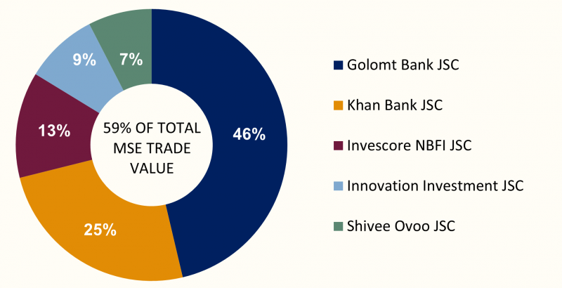Over the course of the week, a total of 5.9 million securities with a combined value of MNT 7.1 billion were traded on the Mongolian Stock Exchange. In terms of trading value, the most actively traded companies were Golomt Bank JSC, Khan Bank JSC, Invescore NBFI JSC, Innovation Investment JSC, and Shivee Ovoo JSC. During the same period, two block trades were executed: