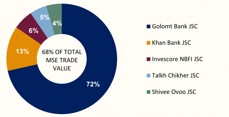 Over the course of the week, a total of 7.6 million securities with a combined value of MNT 6.6 billion were traded on the Mongolian Stock Exchange. In terms of trading value, the most actively traded companies were Golomt Bank JSC, Khan Bank JSC, Invescore NBFI JSC, Talkh Chikher JSC, and Shivee Ovoo JSC. During the same period, two block trades were executed: