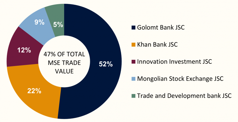 Over the course of the week, a total of 7.4 million securities with a combined value of MNT 6.4 billion were traded on the Mongolian Stock Exchange. In terms of trading value, Golomt Bank JSC, Khan Bank JSC, Innovation Investment JSC, Mongolian Stock Exchange JSC, and Trade and Development bank JSC led market activity, indicating concentration of liquidity in a limited number of actively traded stocks. During the period, a total of one block trade was executed: