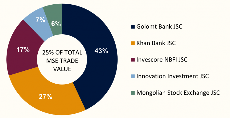 Over the course of the week, a total of 5.09 million securities with a combined value of MNT 7.08 billion were traded on the Mongolian Stock Exchange. In terms of trading value, Golomt Bank JSC, Khan Bank JSC, Innovation Investment JSC, Mongolian Stock Exchange JSC, and Invescore NBFI JSC JSC led market activity, indicating concentration of liquidity in a limited number of actively traded stocks. During the period, a total of one block trade was executed: