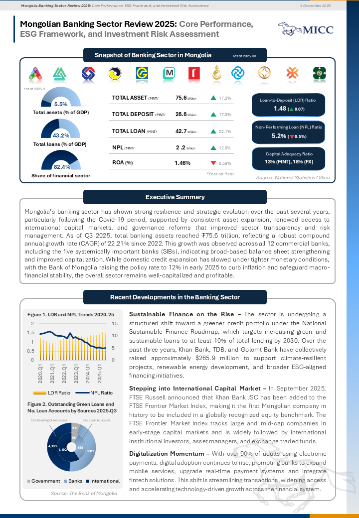 MICC is pleased to present a comparative analysis of the five systemically important banks (SIBs) listed in Tier I of the Mongolian Stock Exchange: Khan Bank, XacBank, Golomt Bank, Trade and Development Bank, and State Bank as part of our latest equity research.