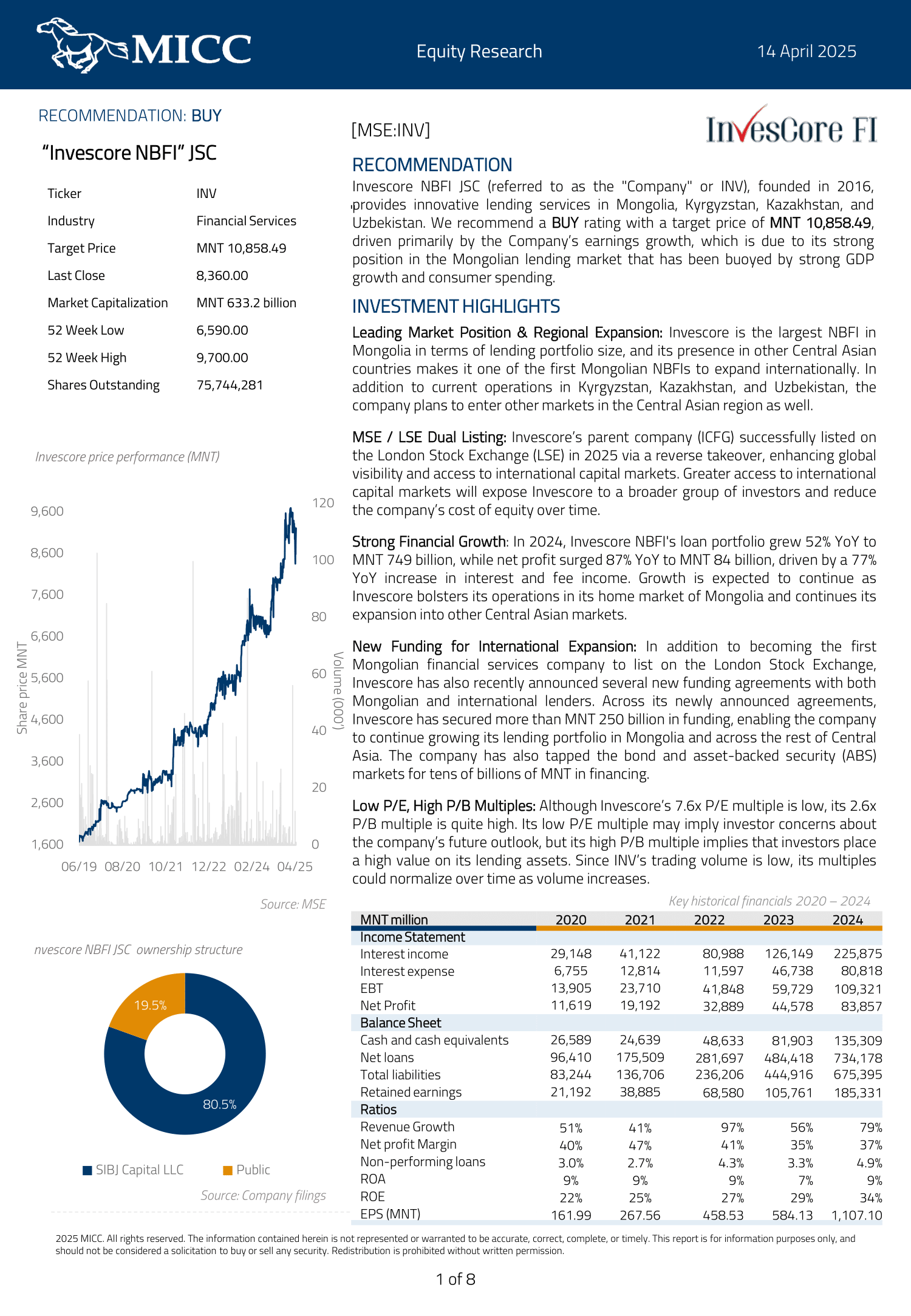 MICC presents its equity research on InvesCore Financial Group NBFI JSC (MSE:INV). We recommend a BUY with a target price of MNT 10,858.49, supported by strong earnings growth, driven by INV’s leading position in Mongolia’s lending market, rising GDP, and robust consumer spending.