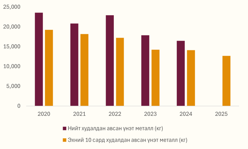 2025 оны 10 дугаар сард Монголбанк нийт 2,829.0 кг үнэт металл (алт) худалдан авч, оны эхнээс өссөн дүнгээр нийт 12.7 тонн хүрсэн байна. Худалдан авалтын хэмжээ өмнөх оны мөн үеэс 10.3%-иар буурсан ба Дaрхан-Уул аймаг дахь Монголбанкны хэлтэс 722.6 кг, Баянхонгор аймаг дахь хэлтэс 1,532.9 кг алтыг тус тус худалдан авчээ. Алт худалдан авах дундаж үнэ тухайн сард 466,946.14 төгрөг байсан гэж мэдээлж байна.
