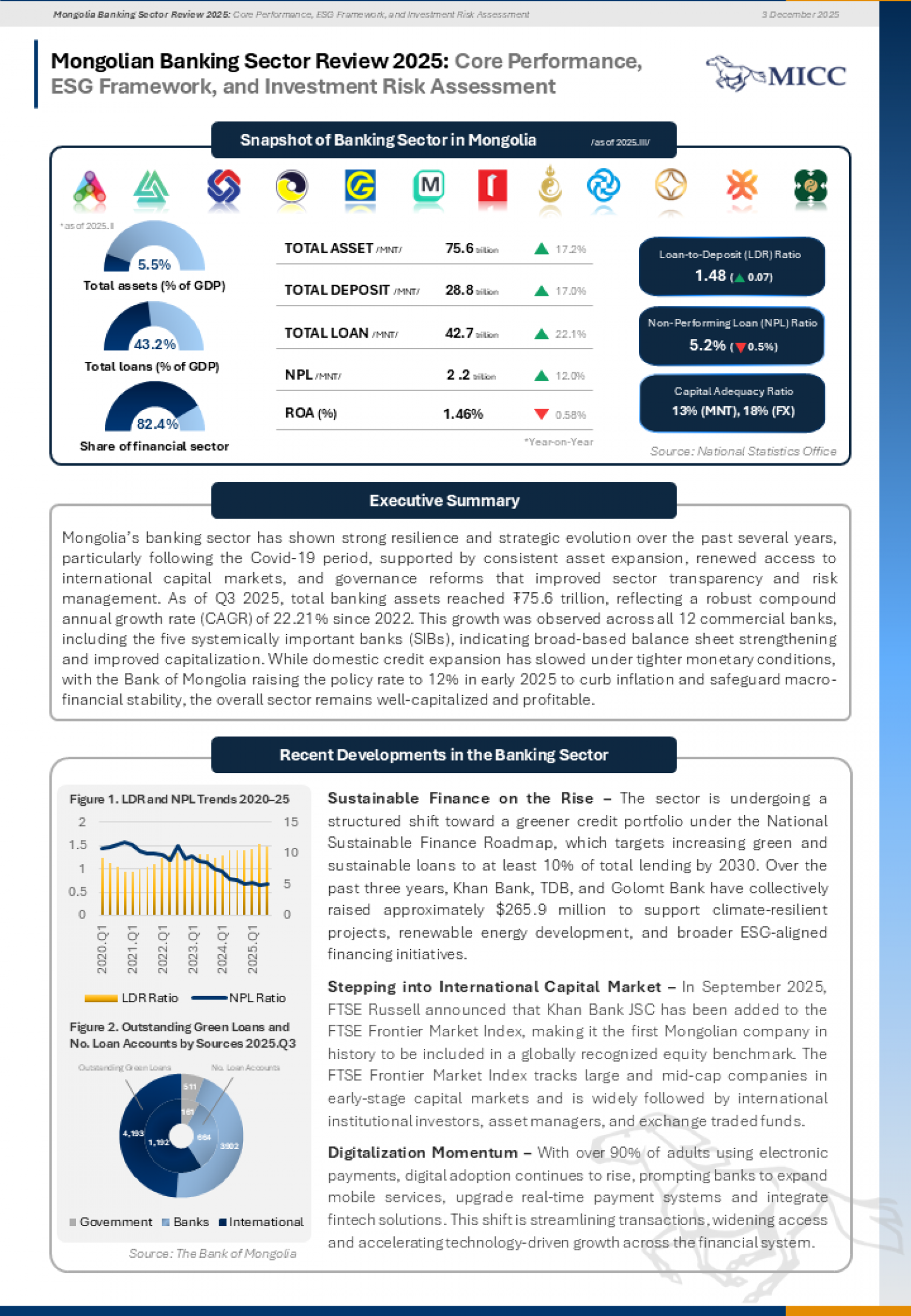 MICC is pleased to present a comparative analysis of the five systemically important banks (SIBs) listed in Tier I of the Mongolian Stock Exchange: Khan Bank, XacBank, Golomt Bank, Trade and Development Bank, and State Bank as part of our latest equity research. At present, the banking sector accounts for 82.4% of the total assets of the financial sector and 5.5% of Mongolia’s GDP. These SIBs demonstrate a high level of concentration, collectively holding approximately 86% of the sector’s total assets